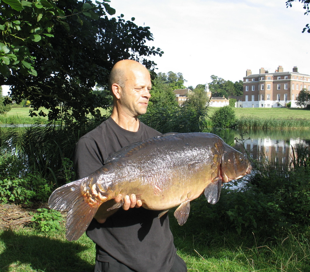 Simon with a 32lb Mirror Carp he caught in Hertfordshire.