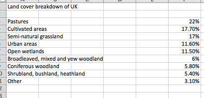 Even including the sheepwrecked uplands, we are still way less than half way to the ONS figure. Where could they have got the other 2.4 million hectares from? I had another look at the infographic – there, winking at me, was a hotlink – “download the data” it said. I felt like Alice looking at the bottle which said “drink me”. I downloaded. The excel spreadsheet opened to reveal……