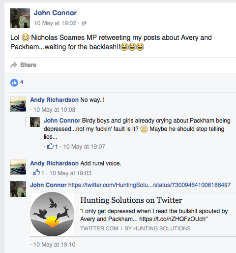 Meanwhile the origin of the story appears to be John Connor, the partner of the Nurse who runs the company Hunting Solutions. Connor realised he had hit paydirt for the pro-hunting anti-Packham campaign, as soon as Soames had retweeted the offending message. Here he is on Facebook: