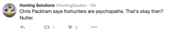 Hunting Solutions, far from recognising the offence they have given to a large proportion of the population, sought to defend their actions by claiming that because Packham called fox hunters psychopaths, he was, literally, “fair game” and called him a “nutter”.
