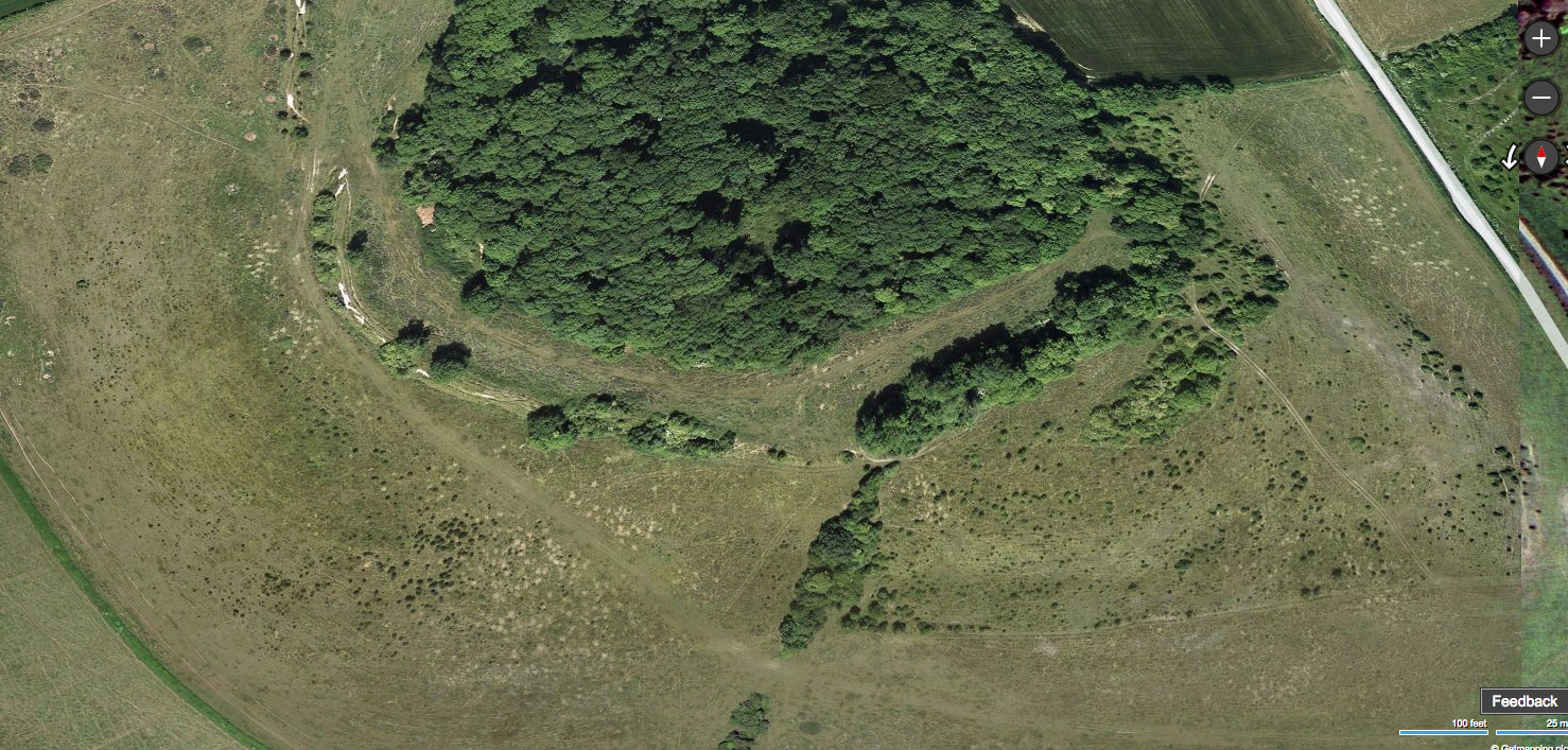 Aerial photo showing the chalk downland around Weatherby Castle. The scattered scrub is clearly visible on the south and west slopes. Attribution: Microsoft product screen shot reprinted with permission from Microsoft Corporation © GetMapping