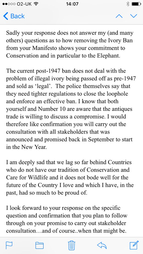 There were a few new things – most notably that the commitment to ban the sale of Ivory less than 75 years old – which had disappeared from the Manifesto, reappeared yesterday. This is much weaker than previous commitments on the ban of Ivory sales – so it’s a mystery why it disappeared altogether, but has now become a commitment again. Definitely something of a u-turn here.