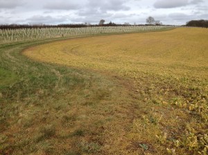 Those stubble “covers” falling into category 1) will vary depending whether you cut them low or high or use a “stripper header”, which leaves the entire stalk intact. Different crops have different amounts and qualities of this stubble “cover” (think of e.g. ryegrass vs peas). They will also have “volunteers” which grow after harvest if you let them – e.g. OSR and barley fields will be covered in green a few weeks after harvest due to the seeds lost from the harvested crop. All our autumn-sown crops will have this “cover” alongside the growing plants themselves – we apply glyphosate to ensure the volunteers (and any weeds) don’t outcompete the new crop.