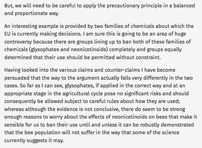 Former Brexit minister Oliver Letwin believes that we should adopt the Precautionary Principle into UK law, but then ignore it for glyphosate. This opinion piece (we are blessed to have a weekly thought from Letwin) is from our local rag the Dorset Echo.