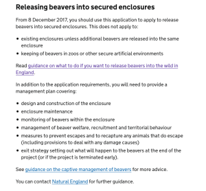 I’ve had some clarification from Christopher Price, CLA, who sent me an NE document from last month that explains the changes in licencing for release of beaver into enclosures. It says this: