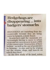 The Telegraph, true to form, blamed the demise of hedgehogs on badgers: “Hedgehogs are disappearing…into badgers’ stomachs” they shrilled.