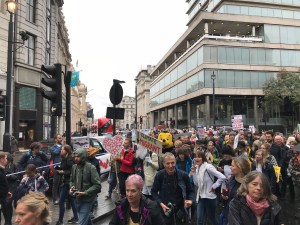 Despite everyone’s best efforts the speeches and singing over-ran. The walk had to start at 1pm sharp, as a series of rolling road-closures parted the traffic on some extremely busy West End streets. The last set of speeches were abandoned. I found myself at the front being herded forward, straining to listen to Billy Bragg singing Where Have All the Flowers Gone, wanting to run back to hear that incredible song. I looked at the crowd behind me as the rain eased off, thinking that maybe a couple of thousand had braved the elements, and that would be impressive. But as the March entered Piccadilly I realised that I could not see its end and that far more people must have arrived to join in. By the time we reached Whitehall it was clear that the police had underestimated how many people were there – and as we were squashed onto the pavement, they re-opened the road where people spilled out to form a substantial crowd.