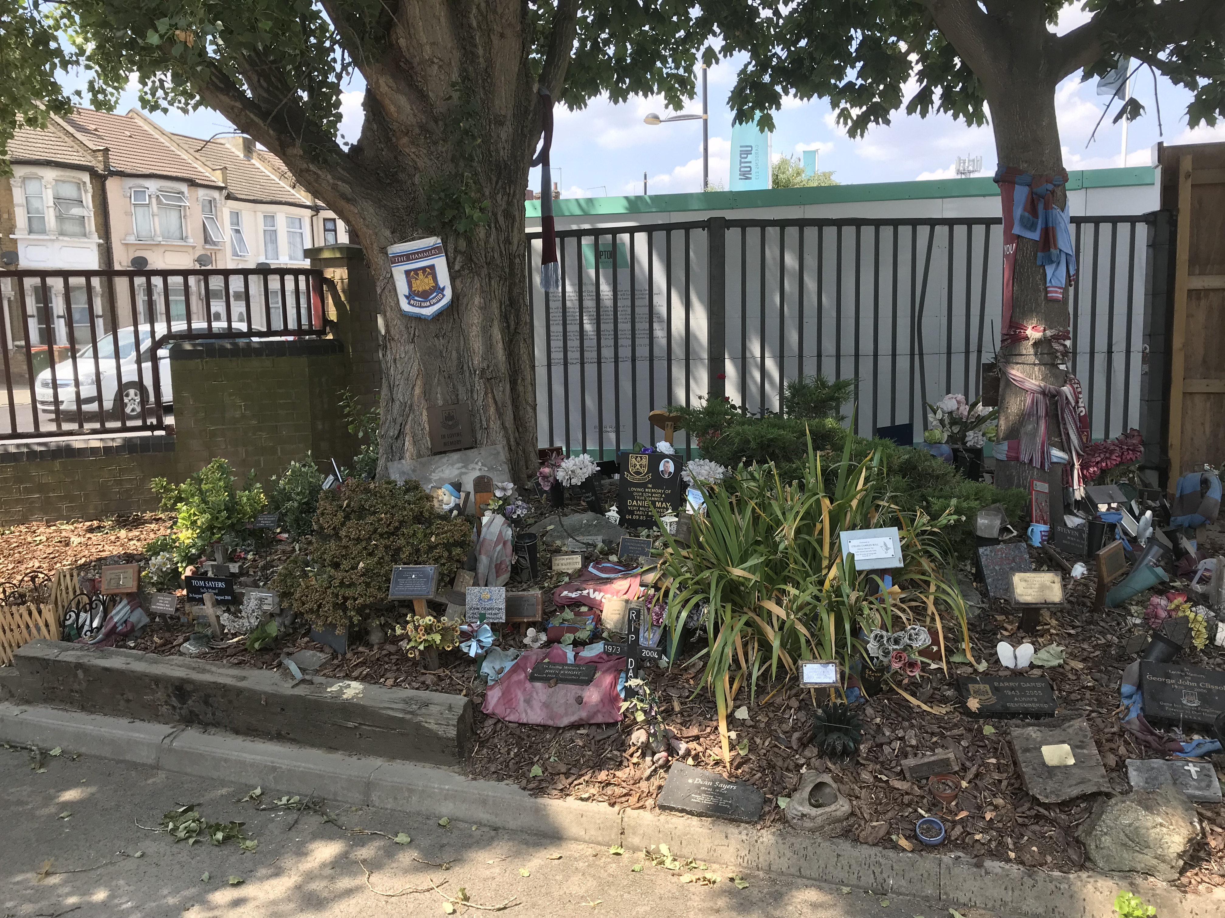 When West Ham sold the Boleyn ground (for a housing development) and moved to Stratford, my mum and I were very concerned about what would happen to the tree and its sacred burial ground. After some cajoling, the developers (Barratts) committed to protecting the tree and creating a new memorial. They asked us for our views about what the memorial would look like and it was gratifying that they recognised how important this place, and that tree, had become.